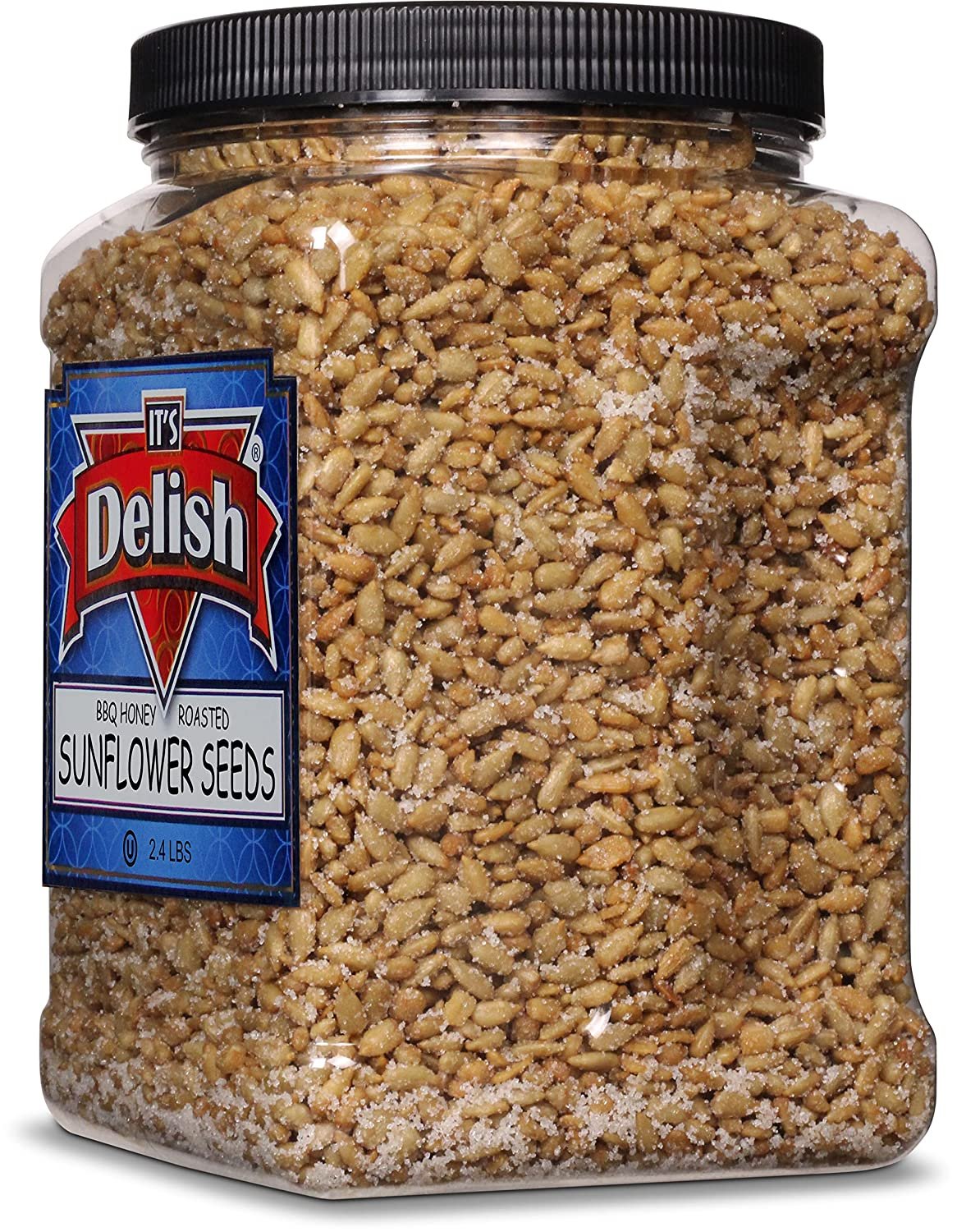 BBQ Honey Roasted Sunflower by It's Delish, 2.4 LBS Reusable Jumbo Container Treat yourself to a mouthwatering snack of BBQ Flavored Sunflower seeds perfectly seasoned with our house special barbecue seasoning used by home cooks and professional chefs paired with honey sugar and a tad of salt to balance the sweetness. Get these in bulk so you have enough for office munching, late night snacking and family parties. These are vegetarian and certified Kosher. Stock up and enjoy!