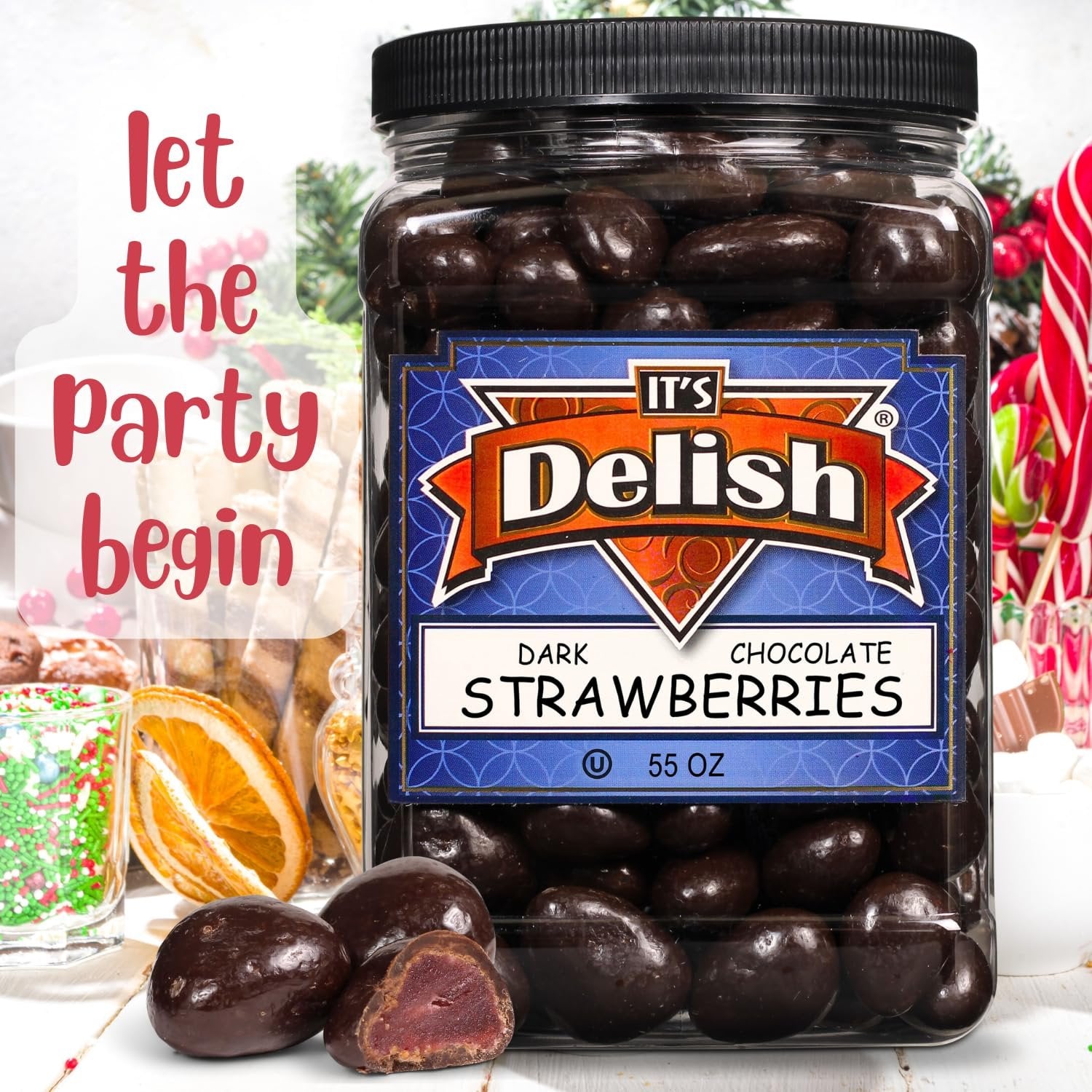Dark Chocolate Covered Strawberries by It's Delish, Jumbo Container Indulge in the irresistible combination of dark chocolate and Dried Strawberries with It's Delish Chocolate Covered Strawberries. Each bite offers a burst of rich and dairy-free dark chocolate. This Jumbo Container is filled to the brim with these delectable candy-dried fruits, providing you with plenty to share or enjoy all to yourself. Whether you're looking for a satisfying snack or a delightful treat to satisfy your sweet tooth, these chocolate-covered Strawberries are sure to hit the spot. Not only are they incredibly delicious, but they are also suitable for a variety of dietary preferences. These vegan and kosher OU treats are crafted with care in our North Hollywood, California factory, ensuring the highest quality and freshness. Try all our flavors and strawberry varieties, including chocolate-covered blueberries, Cranberries and even dried fruit. Stock up and enjoy! It’s Delish! prides itself on the four pillars that are at the foundation of everything we do. Innovation Quality Value Service Ready to Eat Vegan Kosher Quality Ingredients Flavour Milk Chocolate & Dried Strawberries Milk Chocolate & Crunchy Pistachio Milk Chocolate, Toffee & Crunchy Almonds Dark Chocolate, Toffee & Crunchy Hazelnuts Milk Chocolate & Crunchy Sunflower Seeds Dark Chocolate & Dried Mango Bits