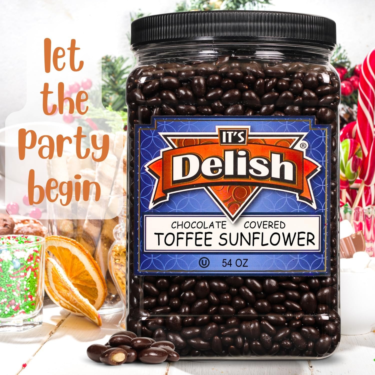 Chocolate Covered Toffee Coated Sunflower by It's Delish, 54 OZ Jumbo Container Indulge in the irresistible combination of dark chocolate, toffee, and crunchy hazelnuts with It's Delish Chocolate Covered Toffee Coated Hazelnuts. Each bite offers a burst of rich and dairy-free dark chocolate that perfectly complements the sweet and crunchy toffee coating. This jumbo 48 oz container is filled to the brim with these delectable candy nuts, providing you with plenty to share or enjoy all to yourself. Whether you're looking for a satisfying snack or a delightful treat to satisfy your sweet tooth, these chocolate-covered hazelnuts are sure to hit the spot. Not only are they incredibly delicious, but they are also suitable for a variety of dietary preferences. These vegan and kosher OU treats are crafted with care in our North Hollywood, California factory, ensuring the highest quality and freshness.