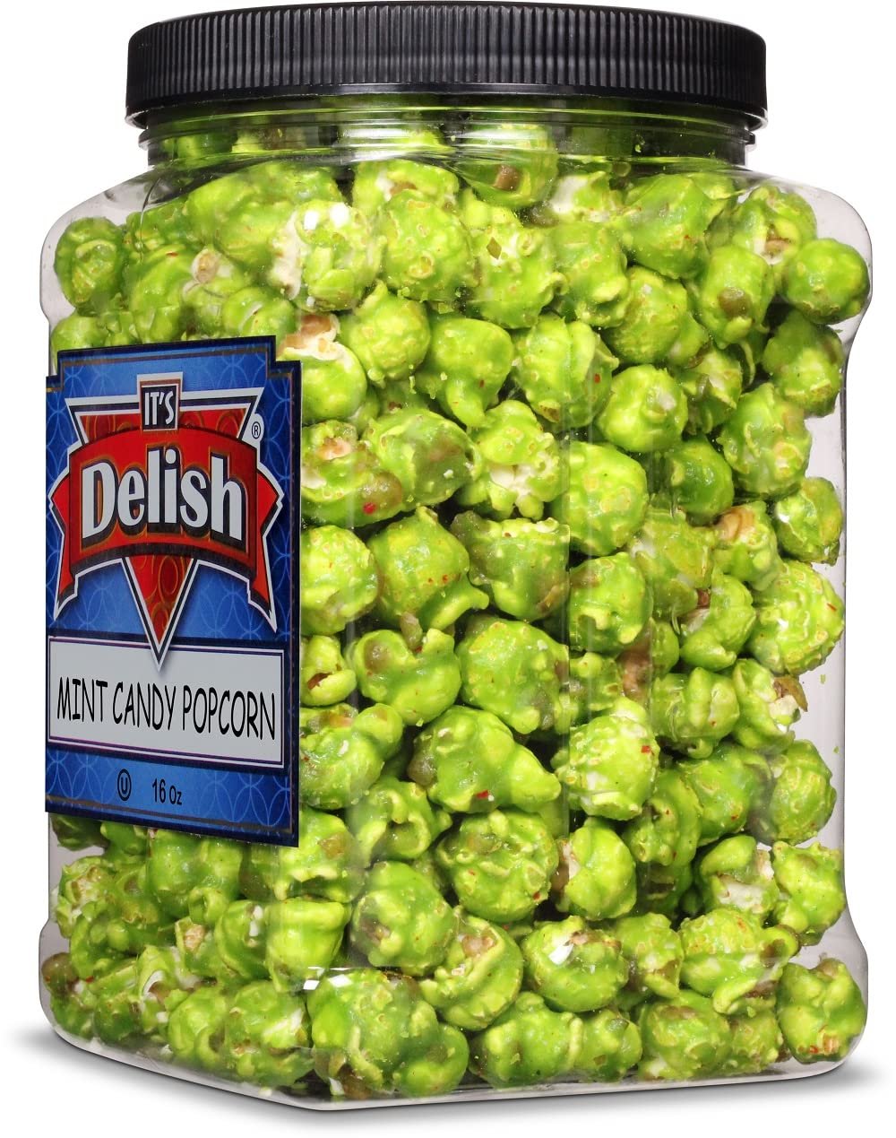 Green Mint Candy Popcorn by Its Delish, 16 Oz Jumbo Reusable Container Treat yourself or make your party a hit with our delicious gourmet green popcorn, mint flavor. Close your eyes, take a sniff... taste each flavor! Mmmm.... refreshing! Plus, the container that packs these popcorn nuts is specifically designed to keep the nuts fresh and crunchy. These fun, fruity colors, minty flavors of popcorn come in a large bulk container to quench your popcorn thirst. Turn the lid of the popcorn container to sniff in the aroma of this yummy mint-flavored popcorn. Plus, when this popcorn finishes, you can reuse the container to store food or stationery items in it. Our green popcorn is non-dairy and proudly made in the USA. Kosher certification shows that they are non-GMO.