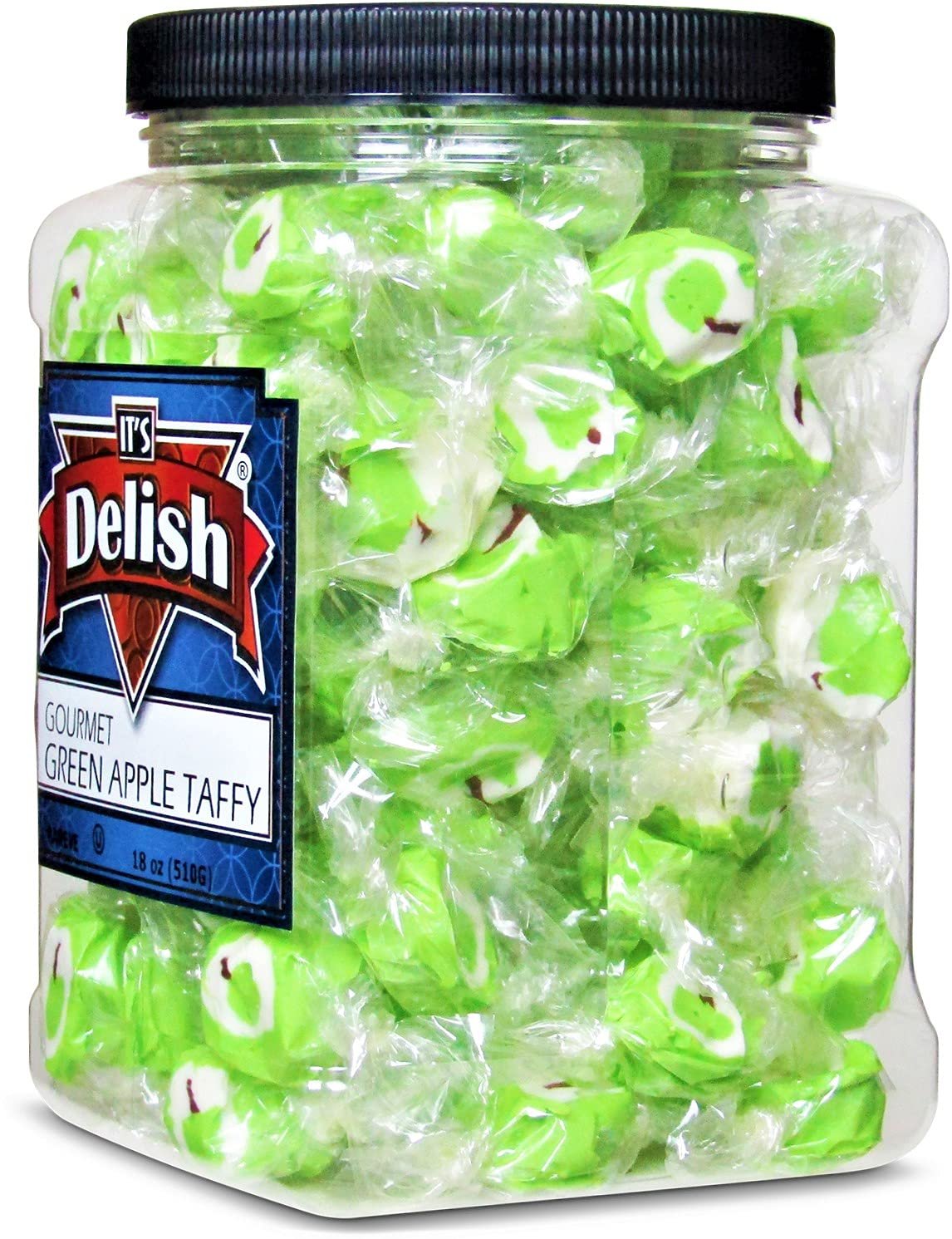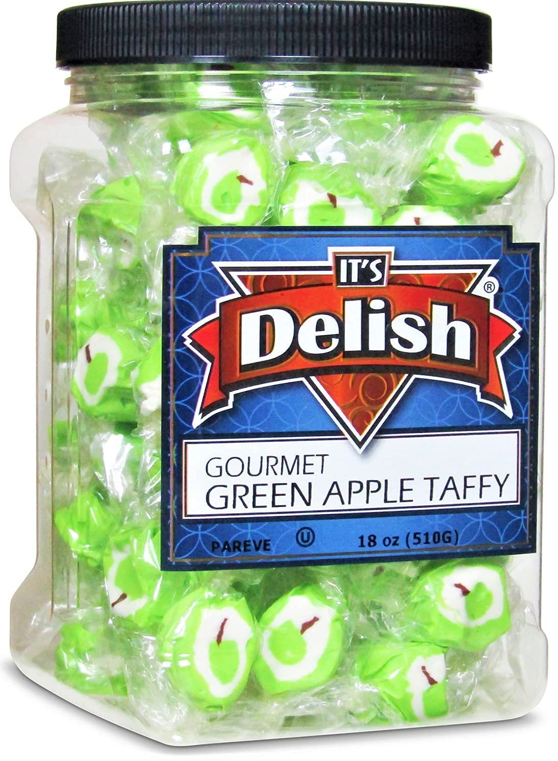 - VALUE SIZE ORIGINAL APPLE TAFFY CHEWS – Eighteen (18 Oz) Ounces bulk container Green Apple Taffy Chews by Its Delish brand. Your taste buds will "go bananas" when you treat them to our Green Apple Taffy Chews. They'll be appreciated by kids and adults alike. Stock up for your pantry and upcoming events.