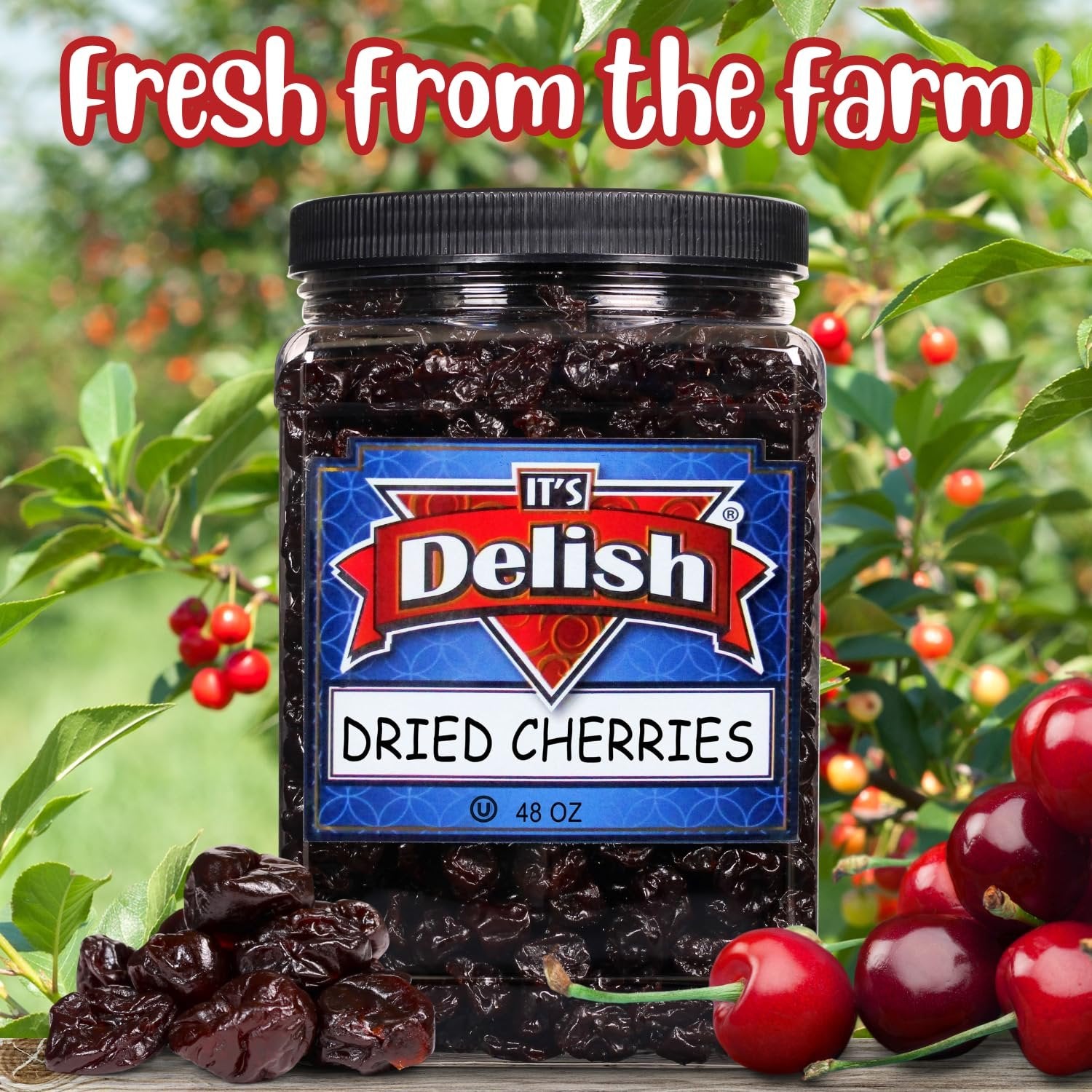 Dried Cherries by It's Delish, Jumbo Reusable ContainerThese cherries, slightly sweet and dark in color like bing cherries, not sour and bright red like tart cherries, are carefully dried to preserve their natural sweetness and flavor, without any added sugar. Packed with the goodness of dried fruit, they are a versatile ingredient for your favorite recipes. Add them to muffins, salads, or even enjoy them as a snack on their own. Our cherries are sourced from quality farms, ensuring the freshest and most delicious dried cherries. With no added sugar, they are a guilt-free option for those watching their sugar intake. Indulge in the rich, dry cherry goodness and elevate your snacks and desserts with our unsweetened dried cherries. Packed in a convenient bulk size container for your convenience. Try them today and experience the sweet and tangy taste of naturally sweet dried cherries!