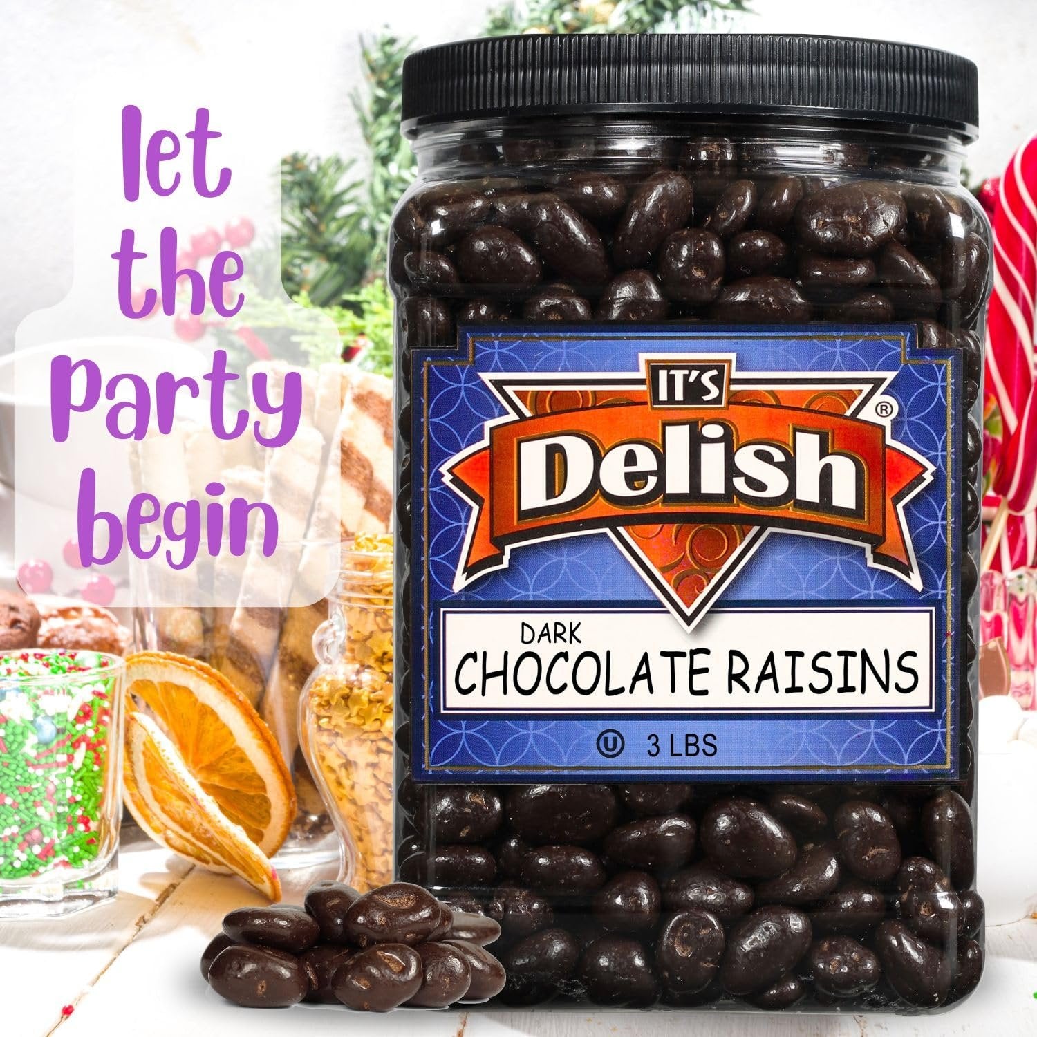 Gourmet Dark Chocolate Covered Raisins by It's Delish, Jumbo Container Indulge in the perfect blend of rich, creamy dark chocolate and chewy, sun-ripened raisins with It's Delish Gourmet Dark Chocolate Covered Raisins. This bulk jar is packed with classic chocolate-covered fruit goodness, making it an irresistible choice for snack lovers of all ages. Whether you're preparing for a party, holiday gathering, or just stocking up on everyday snacks, these chocolate raisins deliver the perfect balance of sweetness and texture. Made in California, these are certified kosher non-dairy OU Parve and vegan chocolate snacks and are crafted in the USA with premium ingredients. They're ideal for candy buffets, dessert tables, office bowls, or satisfying your afternoon chocolate cravings. Not only are they delicious, but they also offer a healthier snack option by combining the natural goodness of raisins with the decadence of dark chocolate. This bulk bag ensures you have plenty to go around—great for family sharing, gift baskets, or keeping your pantry stocked. Whether you're craving a classic chocolate snack or looking for a party-ready treat, It's Delish chocolate covered raisins are a timeless favorite. It's Delish was established in 1992 and is located in North Hollywood, California. It's Delish is a food manufacturer and distributor who produces over 500 gourmet food products including licorice, sour belts, taffies, caramels, Jordan almonds, chocolates, nuts, fruits, trail mixes, spices, and the spice blends. It's Delish also produces organics and all natural products. We give you the opportunity to order from the factory direct! It’s Delish! prides itself on the four pillars that are at the foundation of everything we do. Innovation Quality Value Service Rich Chocolate Coating: Juicy California raisins generously covered in smooth chocolate; this irresistible combination of fruit and candy creates a classic snack that delivers on both indulgence and satisfaction in every bite Perfect Party Treat: Comes in a large three pound jumbo container; ideal for candy buffets, dessert tables, party favors, or events; serve straight from the bag or transfer to jars and trays for easy sharing at gatherings, celebrations, and holiday parties Snack Anytime, Anywhere: Great for lunchboxes, office snacks, road trips, or after-dinner cravings; enjoy a chocolate-covered fruit snack that feels like a treat while offering the familiar comfort of a traditional favorite Made in California: Proudly made in the USA with quality ingredients; certified Kosher Parve for added trust and satisfaction; enjoy a classic chocolate snack crafted to meet high standards and packed fresh for long-lasting flavor Healthy Meets Delicious: Combines naturally sweet raisins with a dark chocolate coating; a snack that delivers real fruit benefits and rich chocolate taste in one bite; satisfy cravings while making a smarter snacking choice