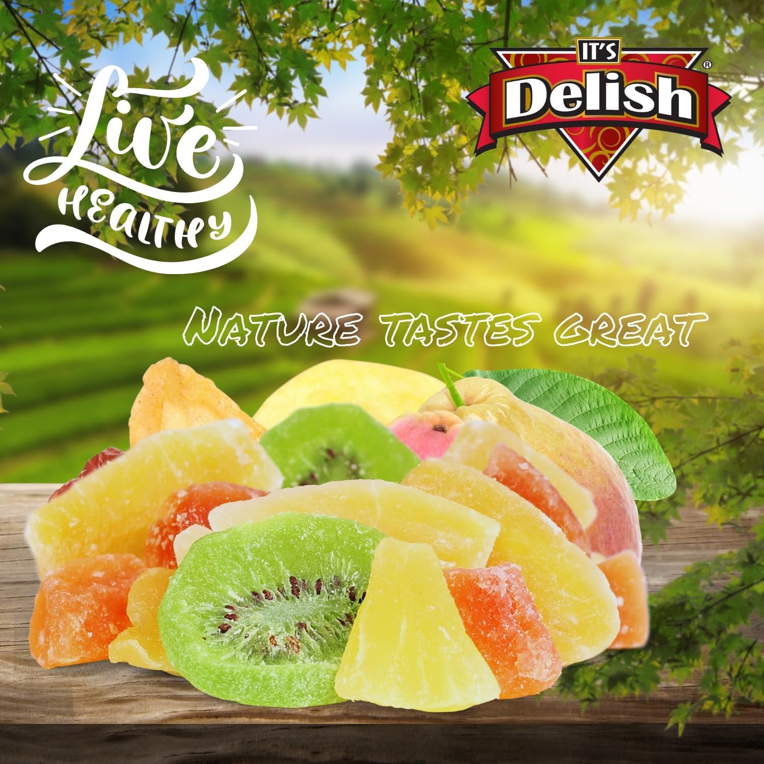 Tropical Dried Fruit Mix Chunks - by Its Delish, Jumbo ContainerEmbark on a tantalizing taste adventure with our Dried Mixed Fruit Chunks Medley by Its Delish! In this bulk size jar, you'll find a symphony of flavors featuring succulent nicely cut dried exotic mango slices, tasty pineapple chunks, cute dried kiwi and sweet papaya dices. This trail mix is a gourmet delight crafted for those who crave a burst of sweetness in every bite. Perfect for adults, kids, and even your furry friends, this snack is a tasty indulgence that's gluten-free, vegan, and kosher. Treat yourself to a mixed fruit snack sensation that will leave your taste buds singing with joy!