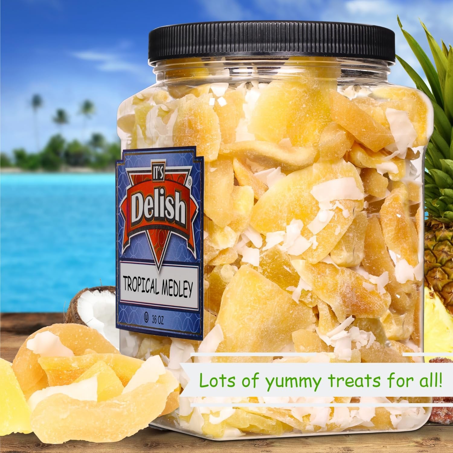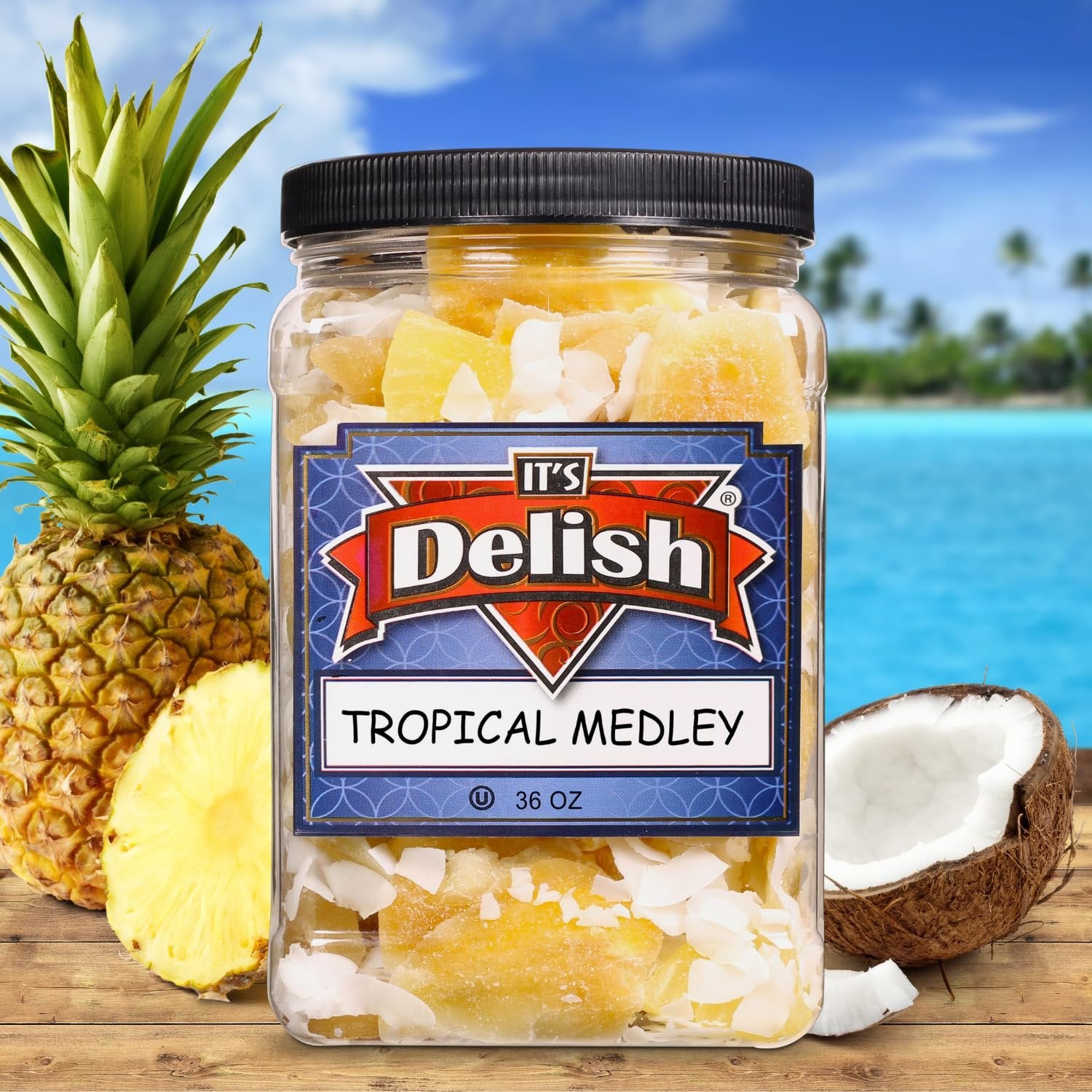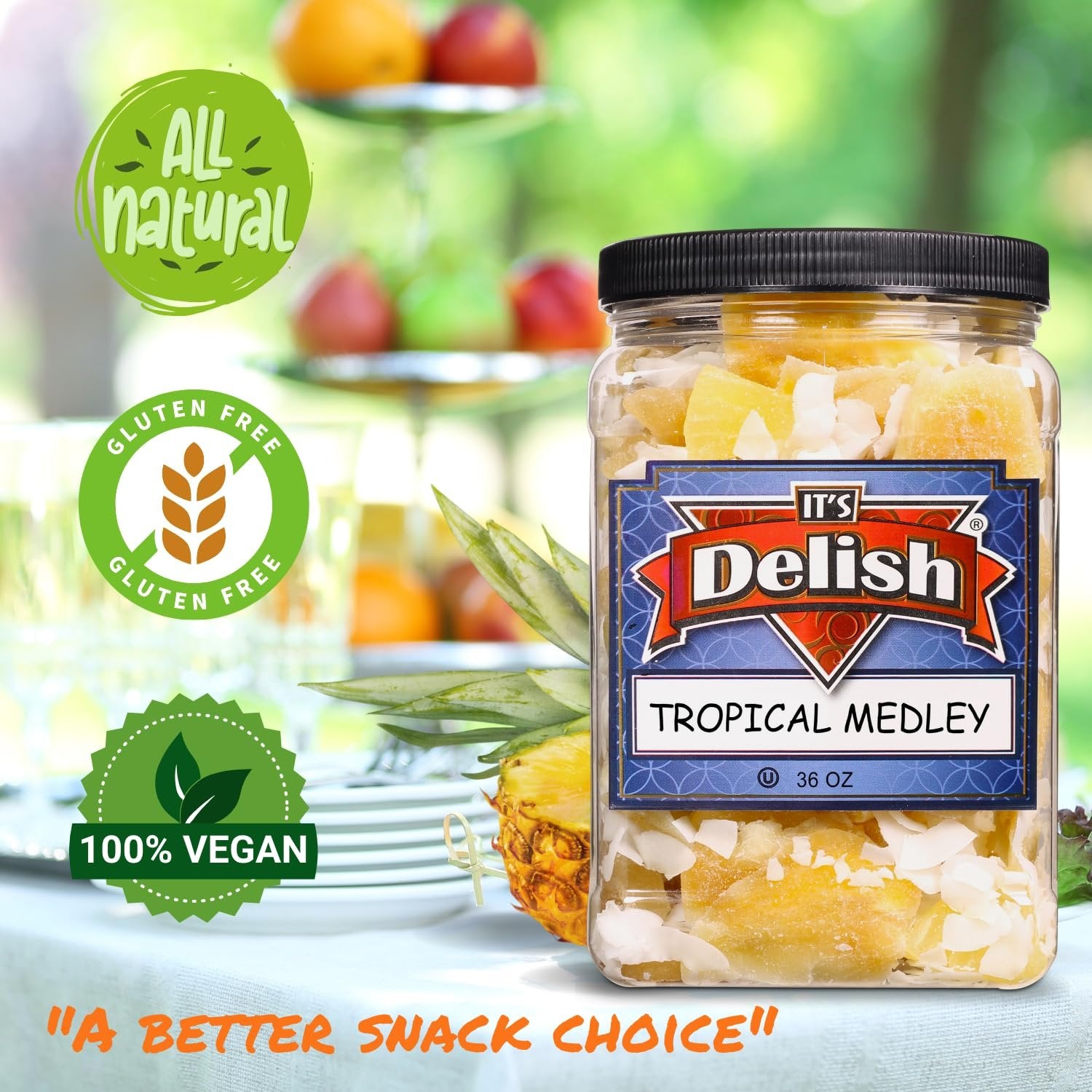 Tropical Dried Fruit Mix Medley - by Its Delish, 2.5 LBS (40 OZ) Jumbo Container Embark on a tantalizing taste adventure with our Dried Mixed Fruit Chunks Medley by Its Delish! In this bulk size jar, you'll find a symphony of flavors featuring succulent nicely cut dried exotic mango slices, tasty pineapple chunks, healthy coconut and sweet guava pieces. This trail mix is a gourmet delight crafted for those who crave a burst of tropical sweetness in every bite. Perfect for adults, kids, and even your furry friends, this snack is a tasty indulgence that's gluten-free, vegan, and kosher. Treat yourself to a mixed fruit snack sensation that will leave your taste buds singing with joy!