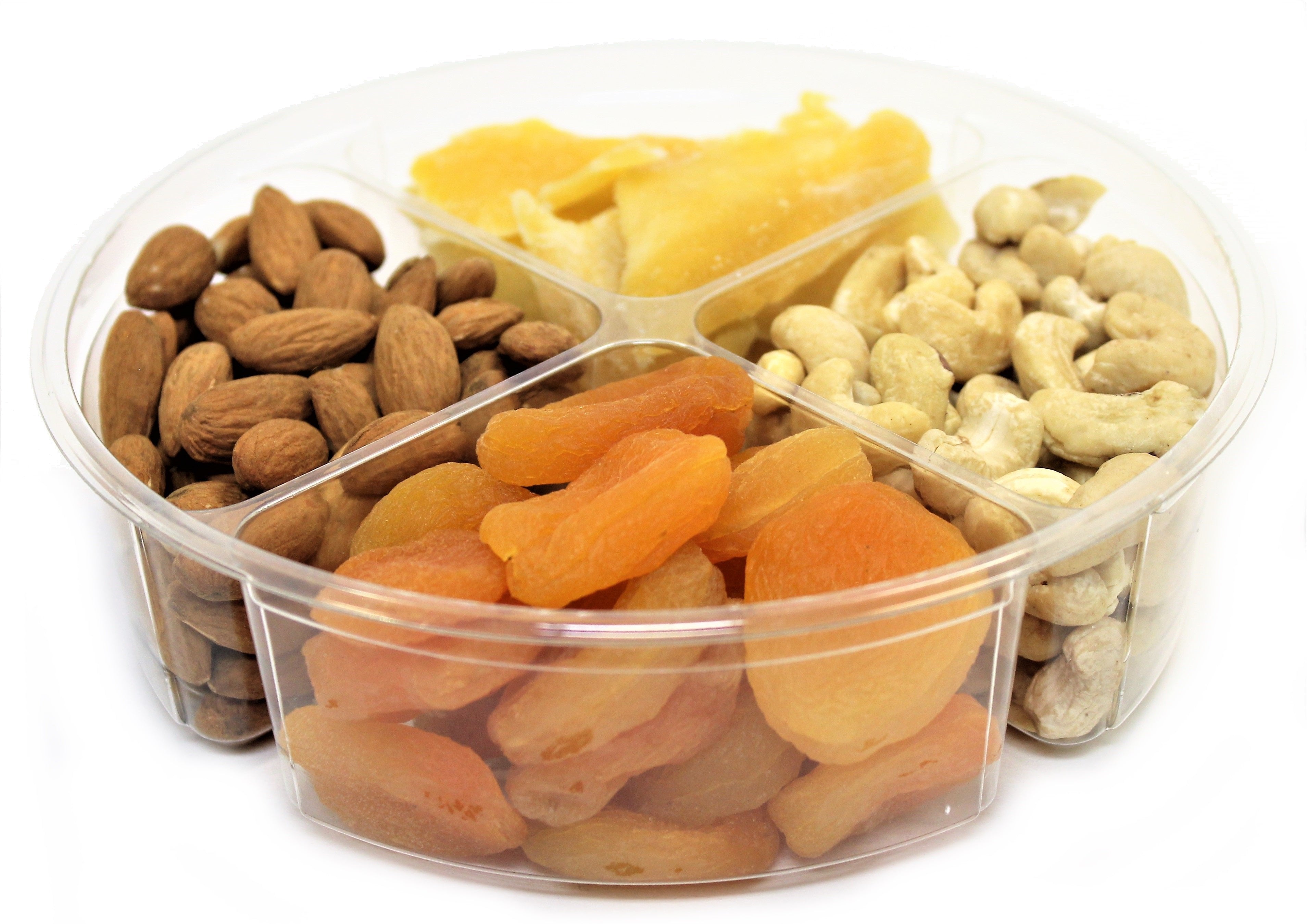 GIFT BASKET 4 section variety gift tray incl. Fresh raw unsalted Almonds and Cashews, Fresh Dried Mango, and Apricots.