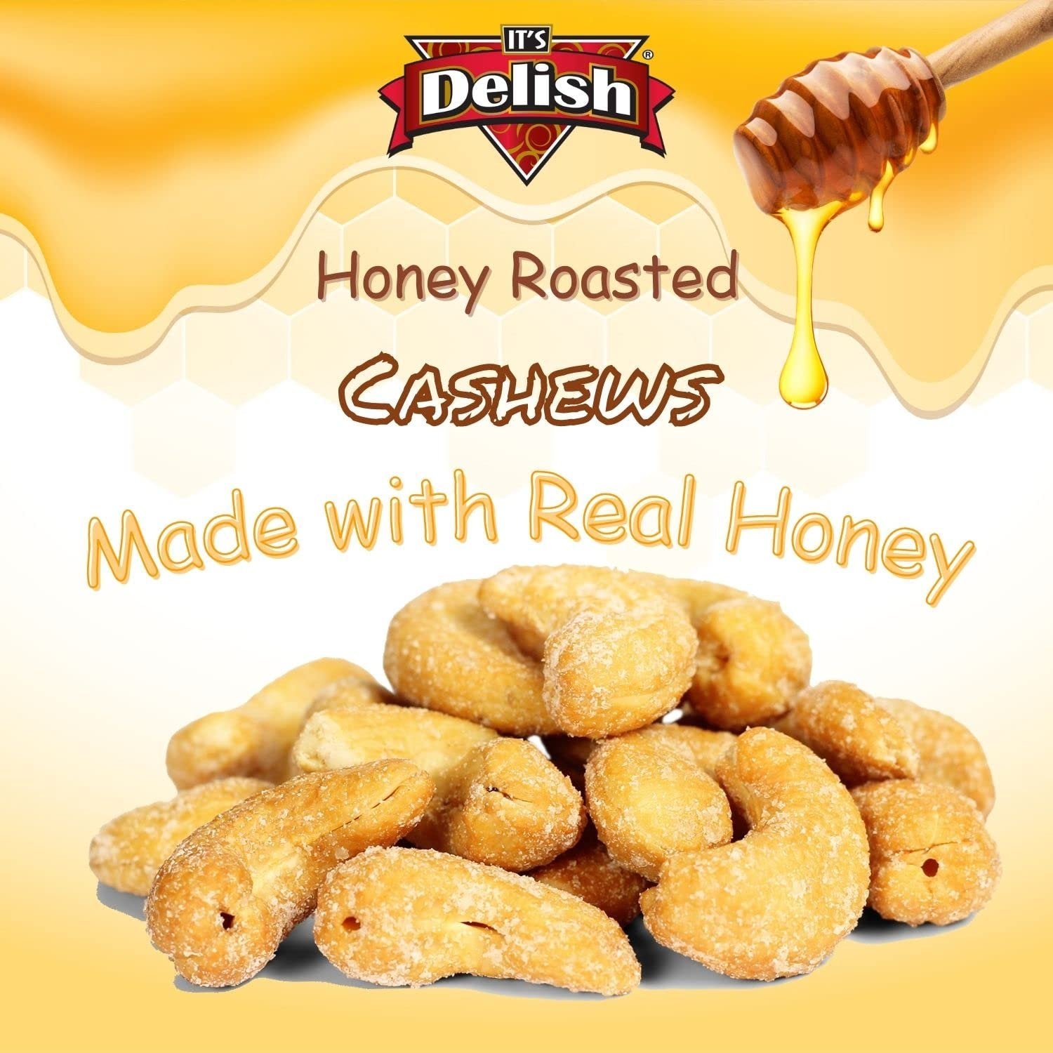 Gourmet Honey Roasted Cashews by Its Delish, 36 Oz Reusable Jumbo Container Treat yourself to a mouthwatering snack of cashew nuts perfectly seasoned with honey sugar and a tad of salt to balance the sweetness. Get these in bulk so you have enough for office munching, late night snacking and family parties. These are vegetarian and certified Kosher. Stock up and enjoy!