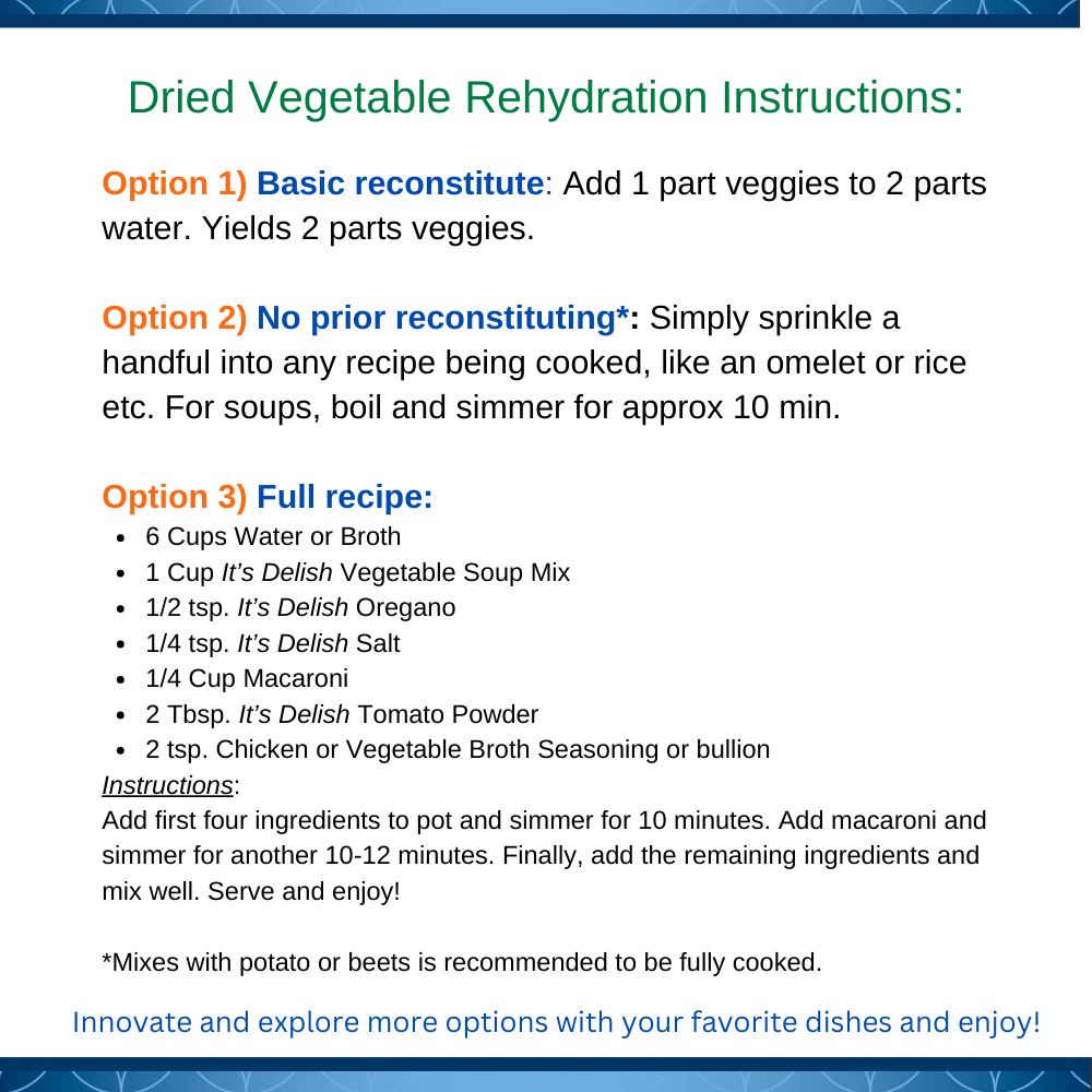 Garden Deluxe Vegetable Soup Mix by It’s Delish 16 Natural Dehydrated Vegetables for Cooking, Camping, Emergency Food Supply and More This is our most special blend of 16 different vegetables and herbs. Enhance your cooking with this all-natural vegetable soup mix by It’s Delish. A blend of delicious vegetables, this soup mix is both tasty and nutritious. Save time in the kitchen without having to do as much prep for recipes by using this bag of dehydrated vegetables in your soup, stew, crock pot recipes, and more..