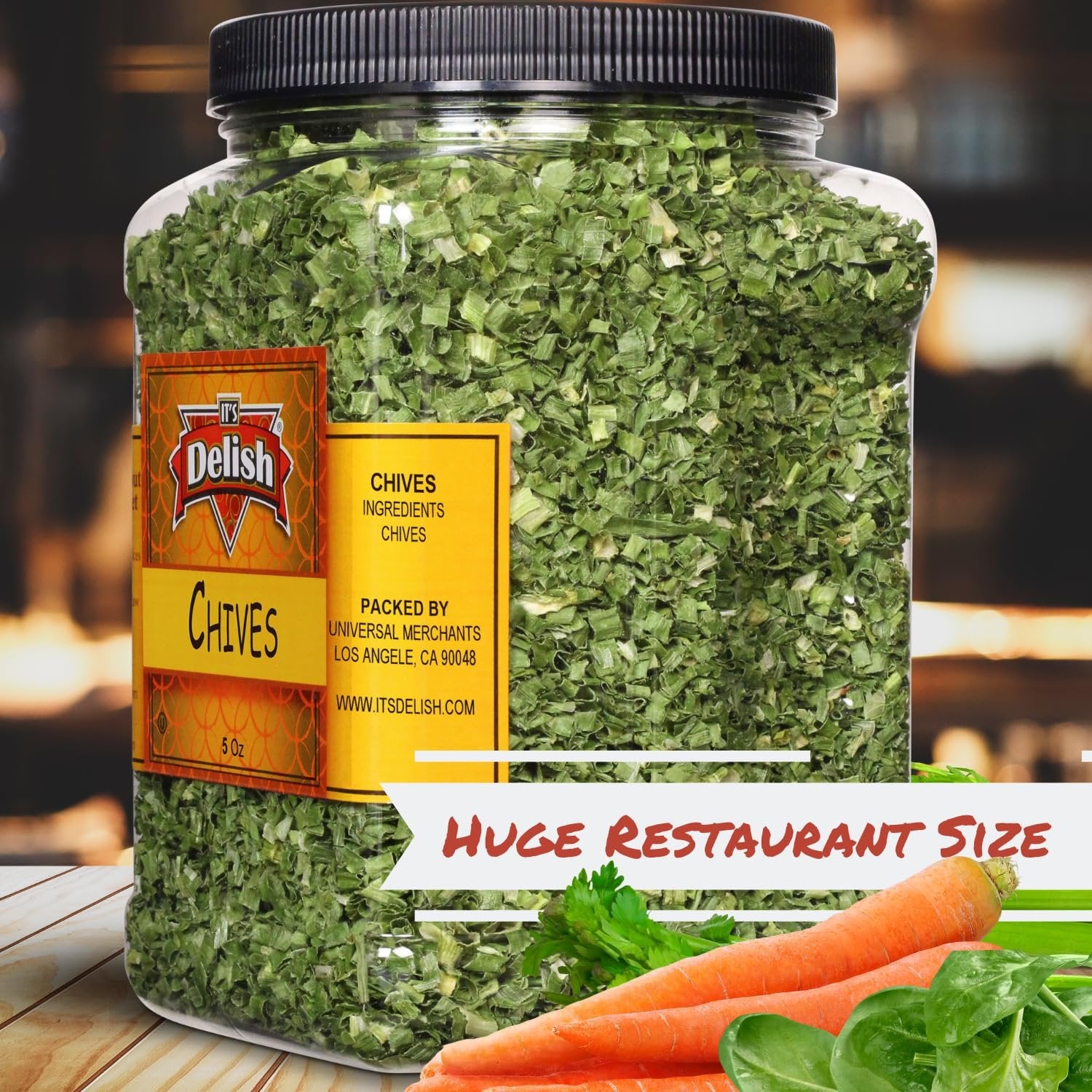 Dried Chives by It's Delish, 5 Oz Jumbo Container Premium Healthy, Rich Vitamin A, C Aromatic Chopped Chive Rings Perfect to brighten and enliven countless dishes. This springtime favorite, allium schoenoprasum by its botanical name, imparts a mild onion flavor that pairs with vegetables, meats, eggs, soups, and salads alike. Variety of Uses: Chives are used with soups, fish, and sandwiches. Delicious Herbs: Chives are one of the fines herbes of French cuisine, which also include tarragon, chervil, or parsley. The product should be stored under normal food warehouse conditions at cool temperatures of 50 ̊-70 ̊F (10 ̊-21 ̊C) with a relative humidity of 70%. Avoid exposure to direct sunlight or excessive heat. The shelf life is 12 months packed as bulk and 36 months in a packaged container. Capacity or Yield: 1 cup yields 1 cup (by the volume) or 5 ounces (by weight)