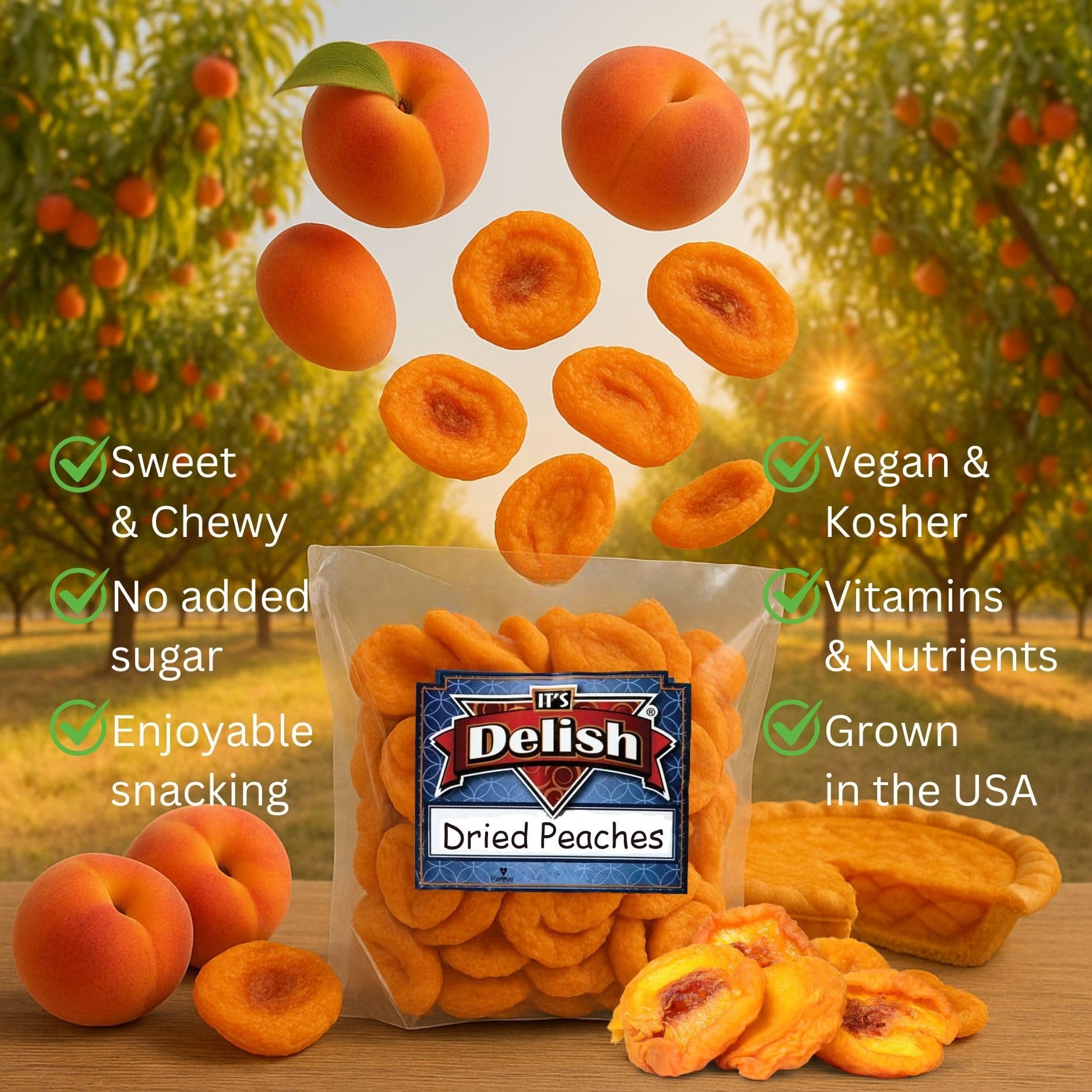 Its Delish California Dried Peaches - a delicious and nutritious snack that will satisfy your cravings! These premium quality dried peaches are sourced from the sunny orchards of California, where they are carefully picked at the peak of ripeness to capture their natural sweetness and flavor. Each peach is then dried to perfection, resulting in a chewy and tender texture that will delight your taste buds.