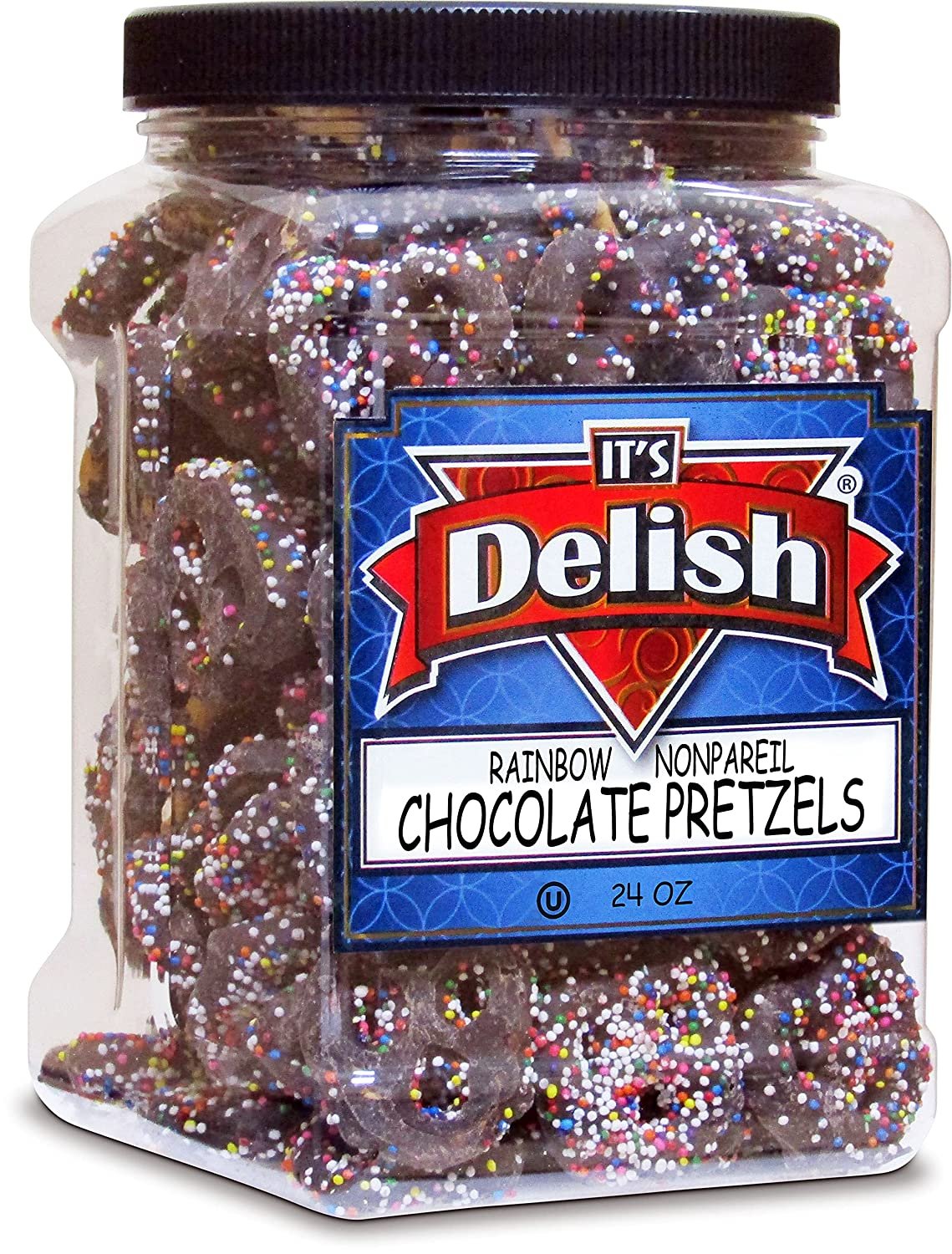 - DELICIOUS GOURMET CHOCOLATE COVERED PRETZELS WITH RAINBOW NONPAREILS – Gourmet Dark Chocolate Covered Mini Pretzels with Rainbow Nonpareil is a snack every youngster and adult loves. Pretzel bites by Its Delish are full of flavor salty, nutty peanut flavor that will tickle your taste buds.